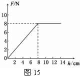 物理兴趣小组同学对物体的浮沉条件进行研究,在一个底面积为200cm2的圆柱形薄壁玻璃容器底部,放一个边长为10cm的正方体物块,然后逐渐向容器中倒水(始终未溢出)。通过测量容器中水的深度h,分别计算出该物块所受到的浮力F浮,并绘制了如图15所示的图像。请你解答下列问题(g取10N/kg)。