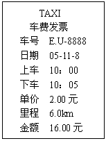 (8分)某人乘出租车在公路上匀速行驶,出租车的牵引力为3×103牛,右图所示,是他乘车到达目的地时,司机所给的车费发票。求出租车在这段时间内做的功。