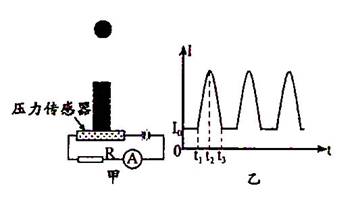 20.如图甲所示,质量不计的弹簧竖直固定在一压力传感器上,压力传感器是电阻阻值随受到压力的增大而减小的变阻器(压力不超过最大值),压力传感器、电流表、定值电阻和电源组成一电路。压力传感器不受力时电流表示数是I0。t=0时刻,将一金属小球从弹簧正上方某一高度由静止释放,小球落到弹簧上压缩弹簧到最低点,然后又被弹起离开弹簧,上升到一定高度后再下落,如此反复。整个过程中,不计能量损失,电流表示数I随时间t变化的图像如图乙所示,则( )