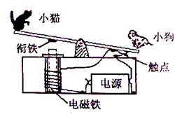 28.如图是小敏自制的一个电磁跷跷板。小狗、小猫模型站在一个可绕光滑转轴的轻质杆上。它的工作过程是:当处于如图位置时,两触点接触,使电磁铁产生磁性,吸引衔铁,小猫端下降,两触点断开,电磁铁失去磁性,在小狗重力的作用下,小狗端下降,反复上述过程。