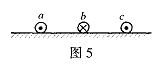 19.如图5所示,在绝缘的水平面上等间距固定着三根相互平行的通电直导线a、b和c,各导线中的电流大小相同,其中a、c导线中的电流方向垂直纸面向外,b导线电流方向垂直纸面向内。每根导线都受到另外两根导线对它的安培力作用,则关于每根导线所受安培力的合力,以下说法中正确的是 ( )