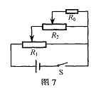 21.在许多精密的仪器中,如果需要较精确地调节某一电阻两端的电压,常常采用如图7所示的电路。通过两只滑动变阻器R1和R2对一阻值为500Ω左右的电阻R0两端电压进行粗调和微调。已知两个滑动变阻器的最大阻值分别为200Ω和10Ω。关于滑动变阻器R1、R2的联接关系和各自所起的作用,下列说法正确的是 ( )