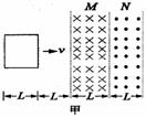 如图甲所示,一有界匀强磁场分M、N两个区域,磁感应强度大小均为B,方向分别垂直纸面向里和向外,两个区域的磁场宽度均为L,在M区域的左侧L处,有一边长为L的正方形导体线框,总电阻为R,且线框平面与磁场方向垂直。现使线框以速度υ匀速穿过两个磁场区域。若以初始位置为起点,规定逆时针方向的电流为正,水平外力向右为正,则图乙中描述线框中的感应电流和水平外力的图像正确的是: