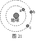 如图21所示,a、b、c是在地球大气层外圆形轨道上运动的3颗卫星,下列说法正确的是:(
