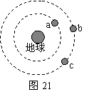 如图21所示,a、b、c是在地球大气层外圆形轨道上运动的3颗卫星,下列说法正确的是:( D )