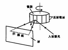 5.为了连续改变反射光的方向,并多次重复这个方向,方法之一是旋转由许多反射镜面组成的多面体棱镜(简称镜鼓).如图所示,当激光束以固定方向人射到镜鼓的一个反射面上时,由于反射镜绕垂直轴旋转,反射光就可以在屏幕上扫出一条水平线.依次,每块反射镜都将轮流扫描一次.如果要求扫描的范围 0 - 450 ,且每秒钟扫描 48 次,那么镜鼓反射镜面的数目和镜鼓旋转的转速分别为郝双