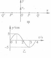 如图甲所示,一根水平张紧的弹性长绳上有等间距 的Q′、P′、O、P、Q 质点, 相邻两质点间距离为1m,t=0时刻O质点从平衡位置开始沿y轴正方向振动,并分别产生向左和向右传播的波,O质点振动图象如图乙所示,当O质点第一次达到正方向最大位移时刻P质点刚开始振动,则