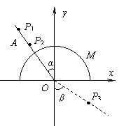 (8分)如图,画有直角坐标系Oxy的白纸位于水平桌面上,M是放在白纸上的半圆形玻璃砖,其底面的圆心在坐标的原点,直边与x轴重合,OA是画在纸上的直线,P1、P2为竖直地插在直线OA上的两枚大头针,P3 是竖直地插在纸上的第三枚大头针,α是直线OA与y轴正方向的夹角,β是直线OP3与y轴负方向的夹角,只要直线OA画得合适,且P3的位置取得正确,测得角α和β,便可求得玻璃得折射率。