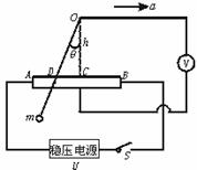 如图所示是一种悬球式加速度仪.它可以用来测定沿水平轨道做匀加速直线运动的列车的加速度。m是一个金属球,它系在细金属丝的下端,金属丝的上端悬挂在O点,AB是一根长为l的电阻丝,其阻值为R。金属丝与电阻丝接触良好,摩擦不计。电阻丝的中点C焊接一根导线.从O点也引出一根导线,两线之间接入一个电压表V (金属丝和导线电阻不计).图中虚线OC为竖直线,且OC=h,电阻丝AB接在电压恒为U的直流稳压电源上.整个装置固定在列车中,AB沿着车前进的方向。当列车加速或减速前进时,金属线将偏离竖直方向的角度为θ,从电压表的读数变化可以测出加速度的大小。