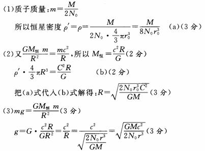 25.(株州2006年3月)设质子的半径为r0,氢气的摩尔质量为M,阿伏加德罗常数为N0,万有引力恒量为G,如果在宇宙间有一个恒星的密度等于质子的密度,假想该恒星的第一宇宙速度达到光速C,电子质量忽略不计,