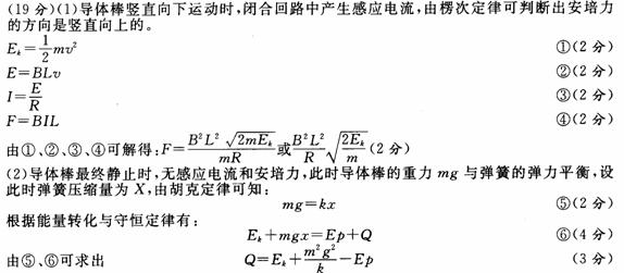 (湖北八市2006年3月)(19分)如图所示,固定的竖直光滑金属导轨,间距为L,上端接有阻值为R的电阻,处在方向水平,垂直导轨平面向里的磁感应强度为B的匀强磁场中,质量为m的导体棒的下端与固定竖直弹簧相连且保持与导轨接触良好,导轨与导体棒的电阻均可忽略,弹簧的劲度系数为K,初始时刻,弹簧恰处于自然长度,导体棒具有竖直向下的初速度,动能为Ek,导体棒在沿导轨往复运动的过程中,导体棒始终与导轨垂直。