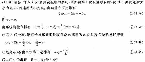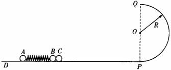 29.(武汉2006年3月)如图所示,光滑轨道的DP段为水平直轨道,PQ段为半径是R的竖直半圆轨道,半圆轨道的下端与水平轨道的右端相切于P点。一轻质弹簧两端分别固定质量为2m的小球A和质量为m的小球B,质量为m的小球C靠在B球的右侧。现用外力作用在A和C上,弹簧被压缩(弹簧仍在弹性限度内),这时三个小球均静止于距离P足够远的水平轨道上,若撤去外力,C球恰好可运动到轨道的最高点Q,已知重力加速度为g,求撤去外力前的瞬间,弹簧的弹性势能E是多少?