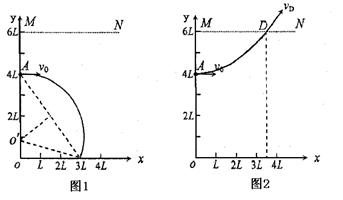 (2006年梧州市高三一模)(20分)如图所示,在xoy平面内,MN和x轴之间有平行于y轴的匀强电场和垂直于xoy平面的匀强磁场,y轴上离坐标原点4L的A点处有一电子枪,可以沿+x方向射出速度为v0的电子(质量为m,电量为e). 如果电场和磁场同时存在,电子将做匀速直线运动.如果撤去电场,只保留磁场,电子将从x轴上距坐标原点3L的C点离开磁场.不计重力的影响,求:(1)磁感应强度B和电场强度E的大小和方向;(2)如果撤去磁场,只保留电场,电子将从D点(图中未标出)离开电场,求D点的X轴坐标?