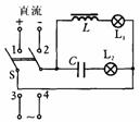 A.当开关置于1、2时,稳定后L1亮、L2不亮