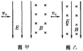 )先后进入方向互相垂直的匀强电场和匀强磁场区域,已知电场方向竖直向下,两个区域的宽度相同且紧邻在一起,在带电粒子穿过电场和磁场的过程中,(其所受重力忽略不计),电场和磁场对粒子所做的功为W1;若把电场和磁场正交重叠,如图乙所示,粒子仍以初速度v0穿过重叠场区,在带电粒子穿过电场和磁场的过程中,电场和磁场对粒子所做的总功为W2,比较W1和W2,则( A )