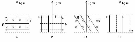9.如图所示,虚线间空间存在由匀强电场E和匀强磁场B组成的正交或平行的电场和磁场,有一个带正电小球(电量为+q,质量为m)从正交或平行的电磁混合场上方的某一高度自由落下,那么,带电小球可能沿直线通过下列的哪个电磁混合场(CD)