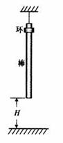 16(15分)、如图所示,一轻绳吊着粗细均匀的棒,棒下端离地面高H,上端套着一个细环。棒和环的质量均为m,相互间最大静摩擦力等于滑动摩擦力kmg(k>1)。断开轻绳,棒和环自由下落。假设棒足够长,与地面发生碰撞时,触地时间极短,无动能损失。棒在整个运动过程中始终保持竖直,空气阻力不计。求: