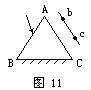 20.如图11所示的三棱镜中,BC面镀有反射膜,一束白光斜射入AB面,经棱镜后在屏幕的bc段形成彩色光带,则b点颜色是____色(屏幕距棱镜的AC面较近且与AC面平行)。