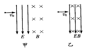 一重力不计的带电粒子以初速度v0(v0<E/B)先后穿过宽度相同且紧邻在一起的有明显边界的匀强电场E和匀强磁场B,如图甲所示,电场和磁场对粒子总共做功W1;若把电场和磁场正交叠加,如图乙所示,粒子仍以v0的初速度穿过叠加场区,电场和磁场对粒子总共做功W2,比较W1、W2的大小