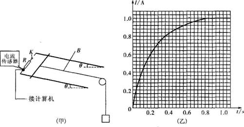 23.(12分)如图(甲)为一研究电磁感应的实验装置示意图,其中电流传感器(相当于一只理想的电流表)能将各时刻的电流数据实时传输到计算机,经计算机处理后在屏幕上同步显示出I-t图像。已知电阻R及金属杆的电阻r均为0.5W,杆的质量m及悬挂物的质量M均为0.1 kg,杆长L=1m.实验时,先断开K,取下细线调节轨道倾角,使杆恰好能沿轨道匀速下滑.然后固定轨道,闭合K,在导轨区域加一垂直轨道平面向下的匀强磁场,让杆在悬挂物M的牵引下,从图示位置由静止开始释放,此时计算机屏幕上显示出如图(乙)所示的I-t图像(设杆在整个运动过程中与轨道垂直,且细线始终沿与轨道平行的方向拉杆,导轨的电阻、细线与滑轮间的摩擦及滑轮的质量均忽略不计).试求: