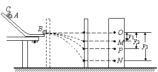④ 完成实验后,实验小组对上述装置进行了如下图所示的改变:(I)在木板表面先后钉上白纸和复写纸,并将木板竖直立于靠近槽口处,使小球A从斜槽轨道上某固定点C由静止释放,撞到木板并在白纸上留下痕迹O;(II)将木板向右平移适当的距离固定,再使小球A从原固定点C由静止释放,撞到木板上得到痕迹P;(III)把半径相同的小球B 静止放在斜槽轨道水平段的最右端,让小球A仍从原固定点由静止开始滚下, 与小球B 相碰后,两球撞在木板上得到痕迹 M和 N;(IV)用刻度尺测量纸上O点到M、P、N 三点的距离分别为y1、y2、y3。请你写出用直接测量的物理量来验证两球碰撞过程中动量守恒的表达式: