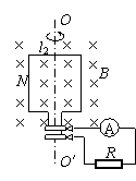 (16分)如图所示,一矩形线圈在匀强磁场中绕OO′轴匀速转动,磁场方向与转轴垂直。线圈的长l1 = 0.50 m,宽l2 = 0.40m,匝数N = 20匝,线圈总电阻r = 0.10Ω。磁场的磁感强度B = 0.10T。线圈绕OO′ 轴以ω = 50rad/s的角速度匀速转动。线圈两端外接一个R = 9.9Ω的电阻和一块内阻不计的交流电流表。求: