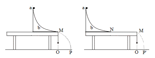 的滑块(可视为质点),b是可以固定于桌面的滑槽(滑槽末端与桌面相切)。第一次实验时,将滑槽固定于水平桌面的右端,滑槽的末端与桌面的右端M对齐,让滑块