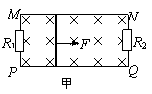 (17分)如图甲所示,光滑且足够长的平行金属导轨MN、PQ固定在同一水平面上,两导轨间距L=1m,电阻R1=3Ω,R2=1.5Ω,导轨上放一质量m=1kg的金属杆,长度与金属导轨等宽,与导轨接触良好,导轨和金属杆的电阻不计,整个装置处于磁感应强度B=0.8T的匀强磁场中,磁场的方向垂直导轨平面向下,现用一拉力F沿水平方向拉杆,使金属杆由静止开始运动。图乙所示为通过R1中的电流平方随时间变化的I12-t图线,求:
