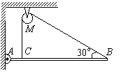 重为60N的均匀直杆AB一端用铰链与墙相连,另一端用一条通过定滑轮M的绳子系住,如图所示,绳子一端与直杆AB的夹角为30°,绳子另一端在C点与AB垂直,AC=0.1AB。滑轮与绳重力不计。求: