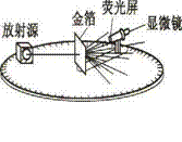 (4分,复选题)如图,卢瑟福利用镭源所放出的α粒子,作为炮弹去轰击金箔原子,测量散射α粒子的偏转情况.下列叙述中符合卢瑟福的α粒子散射实验事实的是:( )
