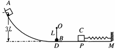 20.(17分)如图,光滑圆弧轨道与水平轨道平滑相连。在水平轨道上有一轻质弹簧,右端固定在墙M上,左端连接一个质量为2m的滑块C。开始C静止在P点,弹簧正好为原长。在水平轨道上方O处,用长为L的细线悬挂一质量为m的小球B,B球恰好与水平轨道相切于D点,并可绕O点在竖直平面内运动。将质量为m的滑块A从距水平轨道3L高处由静止释放,之后与静止在D点的小球B发生碰撞,碰撞前后速度发生交换。经一段时间A与C相碰,碰撞时间极短,碰后粘在一起压缩弹簧,弹簧最大压缩量为