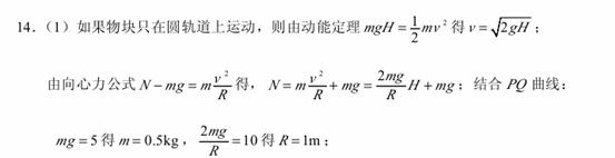 4.(16 分)如图甲所示,一竖内的轨道由粗糙斜面AD 和光滑圆轨道 DCE 组成,AD与DCE 相切于D 点,C为圆轨道的最低点.将物块置于轨道ADC上离地面高为H处由静止下滑,用力传感器测出其经过C 点时对轨道的压力N,改变H 的大小,可测出相应的N 大小,N 随 H 的变化关系如图乙折线PQI 所示(PQ 与 QI 两直线相连接于Q 点),QI 反向延长交纵轴于F 点(0,5.8N),重力加速度g取 10m/s2,求: