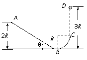 有一个斜直轨道AB与同样材料的1/4圆周轨道BC圆滑连接,数据如图,D点在C点的正上方,距地高度为3R,现让一个小滑块从D点自由下落,沿轨道滑动到A点刚好速度减为零,则它再从A点沿轨道自由滑下所能上升到距离地面的最大高度应是(不计空气阻力)