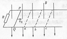 10.如图所示,水平光滑的平行金属导轨,左端接有电阻R,匀强磁场B竖直向下分布在导轨所在的空间内,质量一定的金属棒PQ垂直导轨放置.今使棒以一定的初速度V0向右运动,当其通过位置a、b时,速度分别为Va、Vb到位置c时棒刚好静止.设导轨与棒的电阻均不计,a、b与b、c的间距相等,则金属棒在由a→b和b→c的两个过程中( )