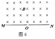 如图6,在一水平放置的平板MN的上方有匀强磁场,磁感应强度的大小为B,磁场方向垂直于纸面向里。许多质量为m带电量为+q的粒子,以相同的速率v沿位于纸面内的各个方向,由小孔O射入磁场区域。不计重力,不计粒子间的相互影响。带电粒子可能经过的区域的面积是(