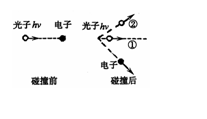 (2) 如图所示为康普顿效应示意图,光子与一个静止的电子发生碰撞,图中标出了碰撞后电子的运动方向。设碰前光子频率为v,碰后为v′,则关于光子碰后的运动方向和频率的说法中正确的是: 。(填代号)