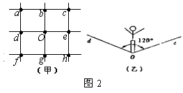杂技表演的安全网如图2甲所示,网绳的结构为正方形格子,O、a、b、c、d……等为网绳的结点,安全网水平张紧后,若质量为m的运动员从高处落下,并恰好落在O点上,该处下凹至最低点时,网绳dOe,bOg均为120° 张角,如图2乙所示,此时O点受到向下的冲击力大小为2F,则这时O点周围每根网绳承受的张力大小为 ( )