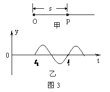 19.如图3甲所示,O点为振源,OP=s,t=0时刻O点由平衡位置开始振动,产生向右沿直线传播的简谐横波。图3乙为从t=0时刻开始描绘的P点的振动图象。下列判断中正确的是( )