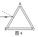 如图4所示,用三块完全相同的两面平行的玻璃板组成一等边三角形(中间是空气),有红光和蓝光组成一细光束以平行底边BC从AB面射入,由AC面射出,则从AC面射出的光束( )