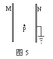 如图5所示,电容量为C的平行板电容器的两极板M、N带有等量异种电荷,其中的N板接地。已知一电子(电荷量为-e)从远处运动到两板间中点P的过程中,电势能增加了E,则由此可推知M极板的带电情况为:( )