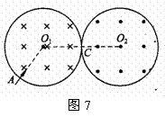 (16分)如图7所示,在某空间实验室中有两个靠在一起的等大的圆柱形区域,分别存在着等大反向的匀强磁场,磁感应强度B=0.10T,磁场区域半径r=
