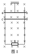 24.(19分)如图8所示,足够长的两光滑导轨相距0.5m竖直固定,导轨电阻不计,下端接阻值为1Ω的电阻R,导轨处于B=0.8T、方向垂直于导轨平面向里的匀强磁场中。两质量均为0.04kg、电阻为0.5Ω的水平金属棒ab和cd与导轨接触良好,ab棒用可承受0.64N拉力的细线悬挂。现让cd从静止下落,直到细绳刚被拉断,在此过程中电阻R上产生的热量为0.2J,g取10m/s2。求: