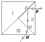 16.如图所示,有三块等腰直角三角形的透明均匀材料(图中的I、II、III)恰好拼成一个正方形。从E点垂直于边射入的单色光在F处发生全反射,