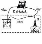 (1)(4分)1821年,德国物理学家塞贝克发现了一种怪现象:如右图把两根铜丝和一根铁丝与灵敏电流计串联成闭合电路,然后把铜丝和铁丝的一个联接点放在盛有冰水混合物的容器里保持低温,另一个联接点放在火焰上加热,升到很高的温度时,发现灵敏电流计的指针发生了偏转,表明闭合电路中产生了电流,这就是温差发电现象.