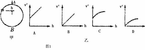 17.如图1甲所示,一个小环套在竖直放置的光滑圆环形轨道上做圆周运动.小环从最高点A滑到最低点B的过程中,其线速度大小的平方v2随下落高度h变化的图象可能是图乙所示四个图中的 ( )