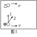 20.如图5所示,甲运动员在球场上得到篮球之后,甲、乙以相同的速度v匀速并排向对方半场奔跑,随后甲运动员将球传给乙运动员,不计空气阻力,则 ( )