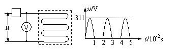 左图所示是某种型号的电热毯的电路图,电热毯接在交变电源上,通过装置P使加在电热丝上的电压的波形如右图所示。此时接在电热丝两端的交流电压表的读数为( )