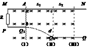 25.(18分)如图所示,两根不计电阻的金属导线MN与PQ放在水平面内,MN是直导线,PQ的PQ1段是直导线,Q1Q2段是弧形导线,Q2Q段是直导线,MN、PQ1、Q2Q相互平行,M、P间接入一个阻值R=0.25W的电阻,一根质量为1.0 kg且不计电阻的金属棒AB能在MN、PQ上无摩擦地滑动,金属棒始终垂直于MN,整个装置处于磁感应强度B=0.5T的匀强磁场中,磁场方向竖直向下,金属棒处于位置(I)时,给金属棒一个向右的速度v1=4 m/s,同时方向水平向右的外力F1=3 N作用在金属棒上使金属棒向右做匀减速直线运动,当金属棒运动到位置(II)时,外力方向不变,大小变为F2,金属棒向右做匀速直线运动,再经过时间t=2 s到达位置(III)。金属棒在位置(I)时,与MN、Q1Q2接触于a、b两点,a、b的间距L1=1 m,金属棒在位置(II)时,棒与MN、Q1Q2接触于c、d两点,已知位置(I)、(II)间距为s1=7.5 m,求: