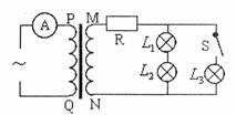 如图所示,理想变压器的副线圈上通过输电线接有三只灯泡L1、L2和L3,输电线的等效电阻,原线圈接有一个理想电流表。开始时开关S接通,当S断开时,以下说法正确的是 ( )