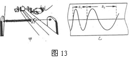 18.(7分)某同学在进行“研究弹簧振子的周期和小球质量的关系”课题实验时,用如图13甲所示装置进行了如下的试验:让弹簧振子穿过一光滑的水平横杆,在弹簧振子的小球上安装一枝笔,下面放一条纸带,当小球振动时,垂直于振动方向以恒定的加速度拉动纸带,加速度的大小为a,这时笔在纸条上画出如图13乙所示的一条曲线,请根据图乙中所测得的长度S1、S2,写出计算弹簧振子振动周期的表达,T=_______________。